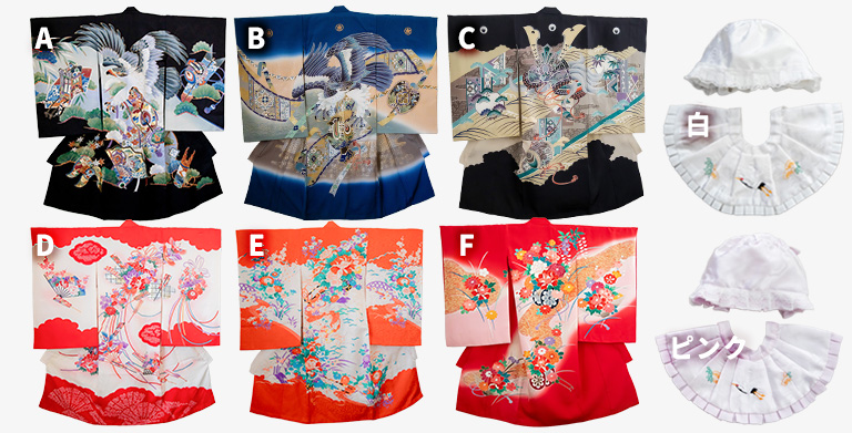 撮影当日の撮影中、当店保管している産着6点、よだれかけ/帽子セット(鶴柄白/ピンク)は無料で貸出し出来ます。※事前予約必須ですので、撮影前日までにご希望の着物をご連絡ください。